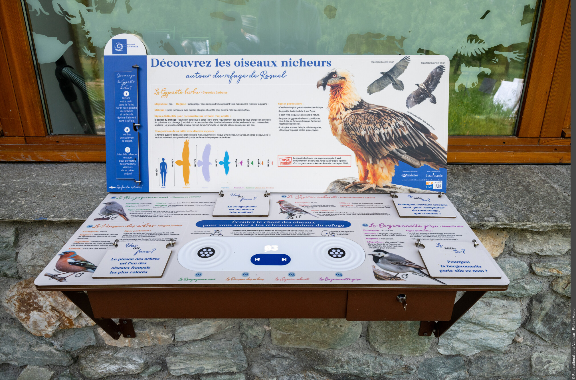 - l'installation en façade d’un pupitre sensoriel (boite à toucher et pupitre sonorisé) afin de découvrir les différentes espèces d'oiseaux et de rapaces qui nichent dans le secteur