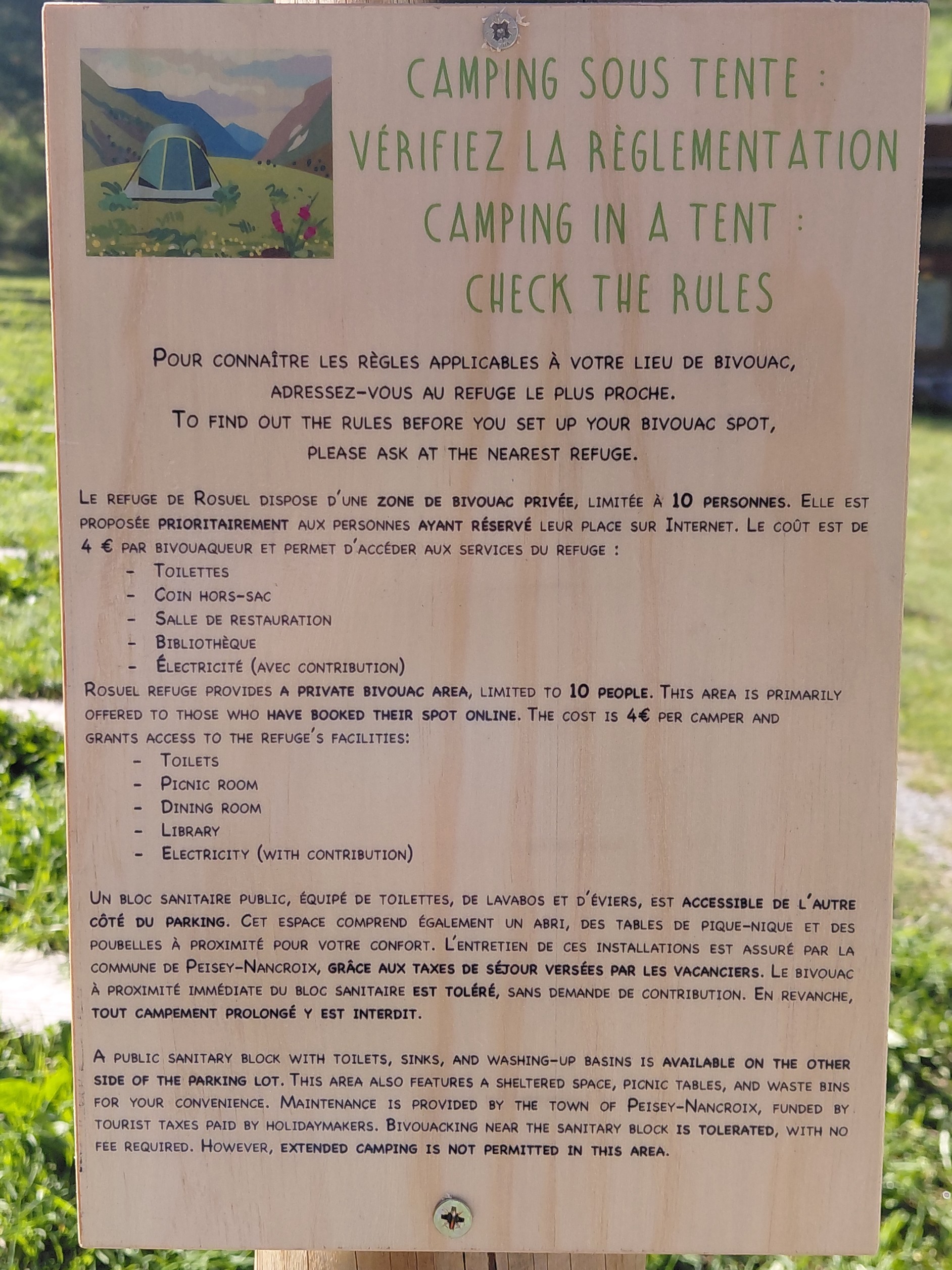 Sur le site de Rosuel, situé à l'entrée du Parc National de la Vanoise, vous pouvez planter la tente à proximité du refuge, comme dans le coeur de Parc, selon les mêmes règles qu'énoncés au dessus.